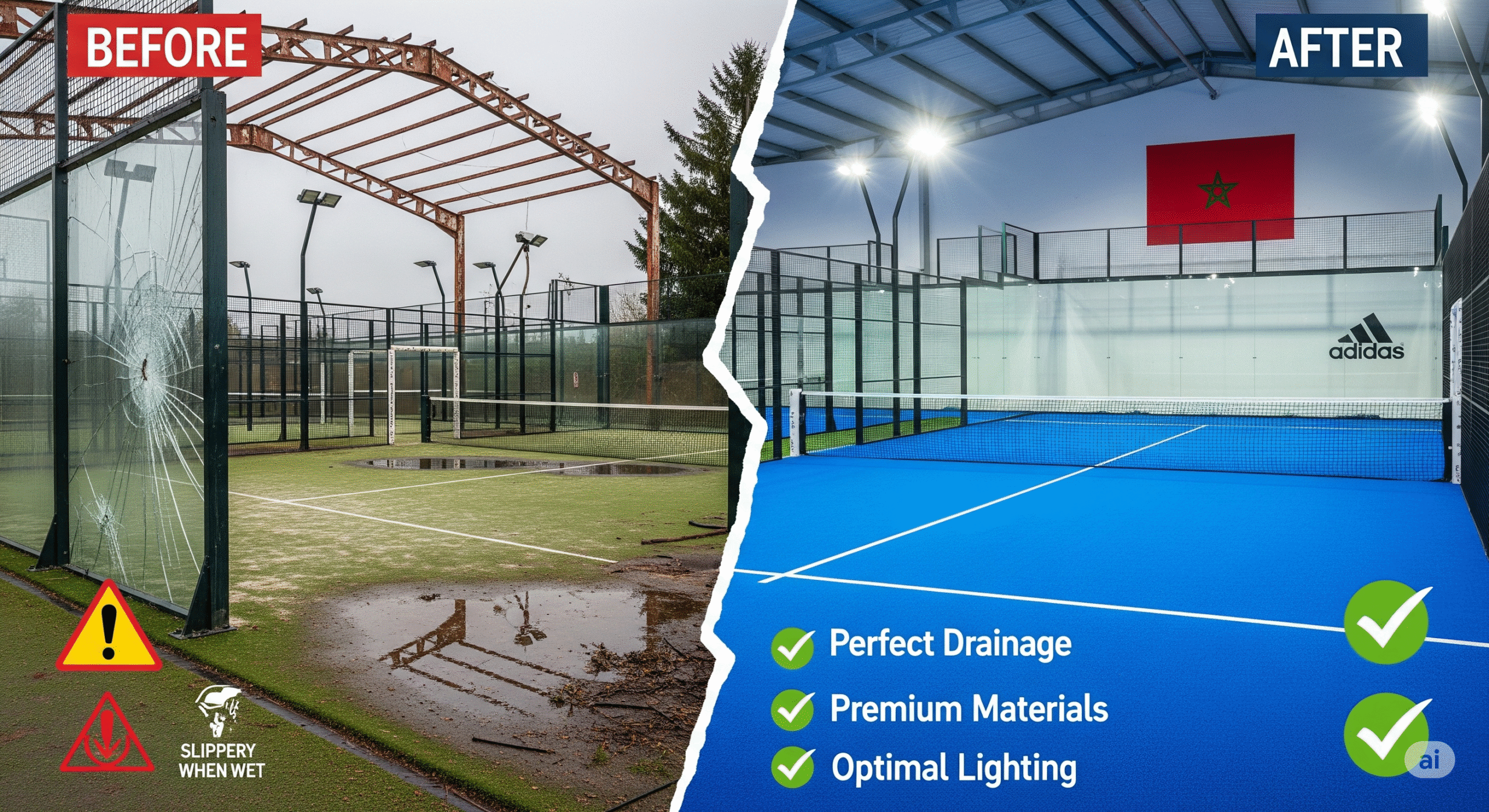 Prix 30-40% inférieur au marché = matériaux non conformes garantis. Verre non trempé (danger mortel), structure sous-dimensionnée (effondrement possible), gazon bas de gamme (usure en 18 mois). Un installateur padel Maroc proposant un terrain complet à moins de 200.000 DH triche forcément quelque part.
