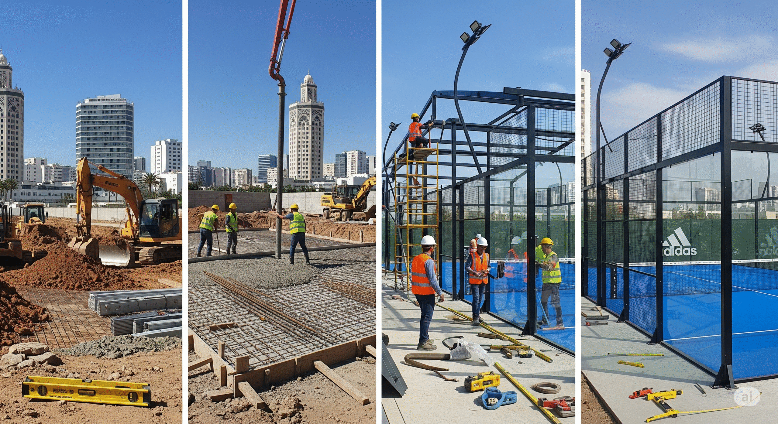 Un installateur padel professionnel suit un processus structuré garantissant la qualité finale. L’étude géotechnique préalable détermine la nature du sol et les adaptations nécessaires – une étape que 60% des installateurs padel Maroc négligent, causant des problèmes structurels ultérieurs. La phase de terrassement dure 3-5 jours incluant l’implantation topographique, l’excavation, et la mise en place des réseaux de drainage. La réalisation de la dalle béton nécessite 2 jours de coulage plus 21 jours de séchage optimal avant la pose de la structure.